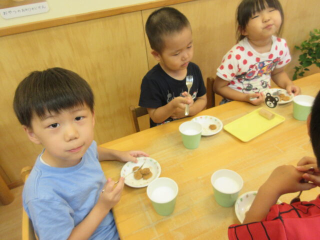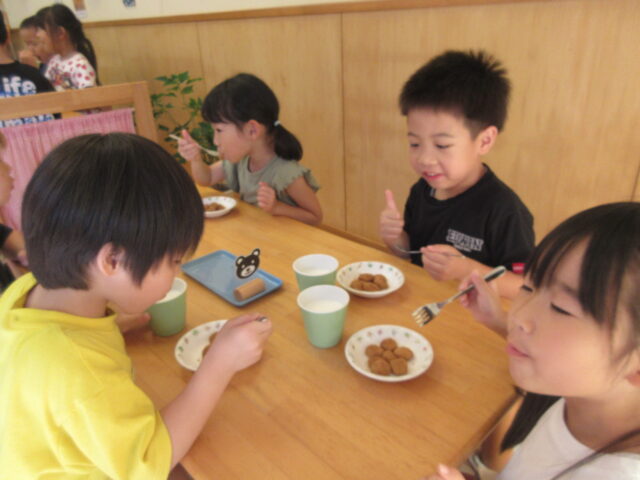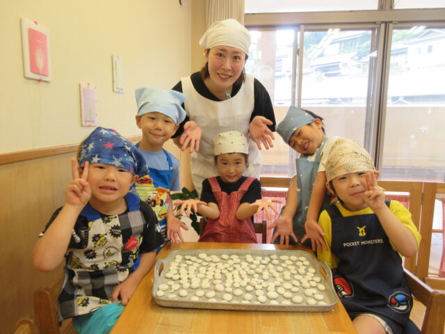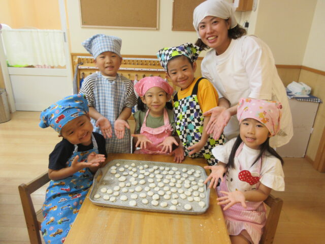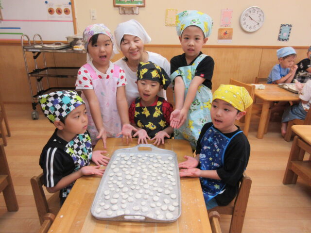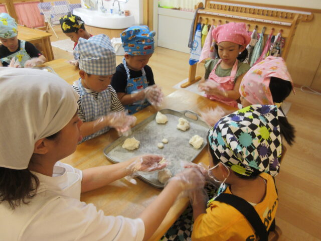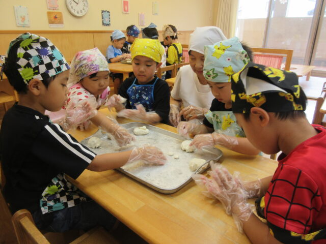 5歳児くまぐみの子どもたちが、おやつのお月見団子を作りました。