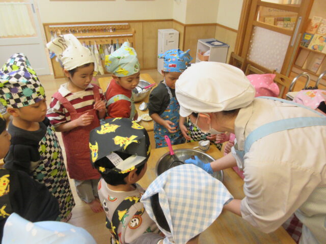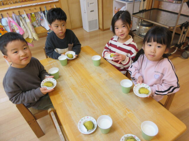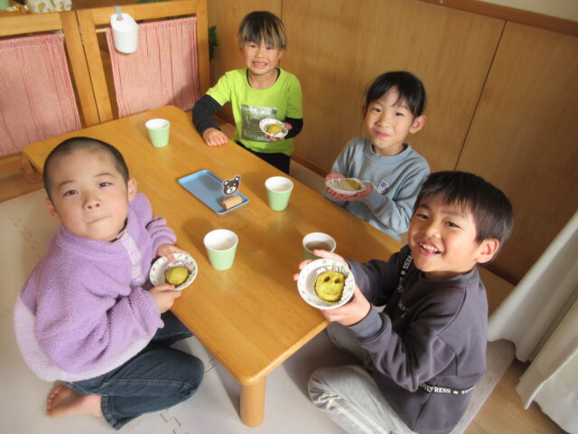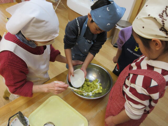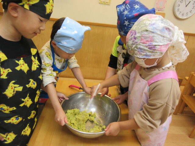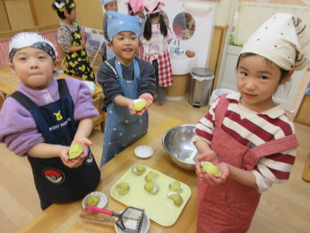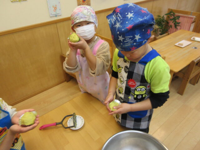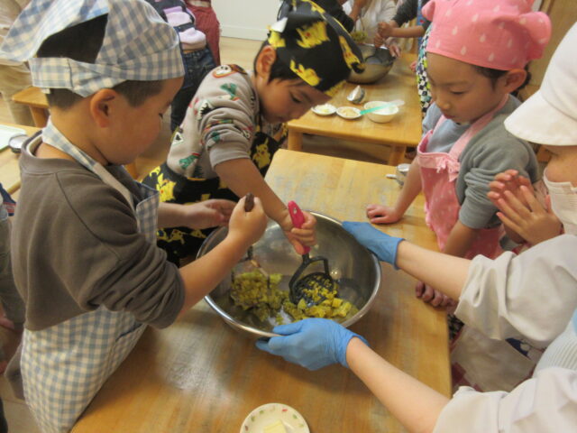 園の畑でとれたさつまいもで、5歳児くま組の子どもたちがスイートポテトを作りました。