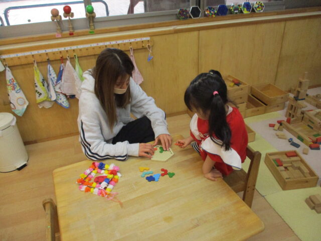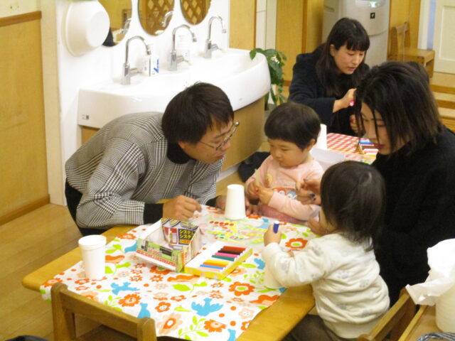 保護者の方と一緒に紙コップにシールを貼ってトントン列車を作ったり、ままごとや積み木遊びを楽しみました。