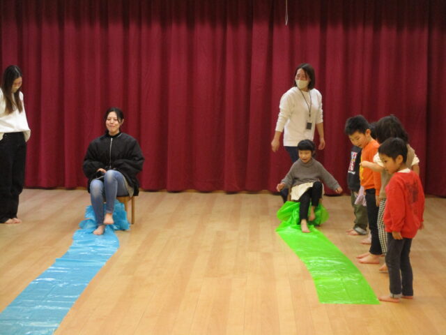 いつも縦割り保育ですが、今日は年齢別でゲーム遊びをしました。3歳児は新聞紙を使ってジャンケンゲーム、4歳児は足でビニールを巻き取るゲーム、5歳児はジャンケン列車でした。どの年齢も盛り上がっていました。笑顔あふれる楽しいひとときを過ごす事ができました。