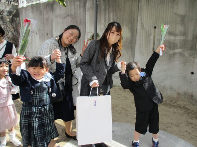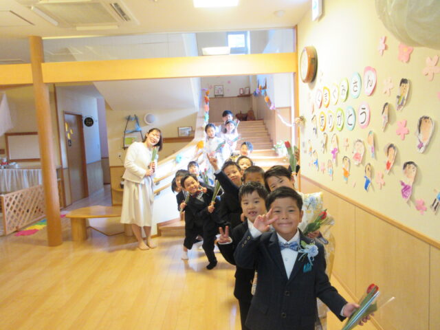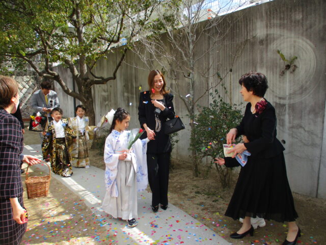 紙吹雪でお見送りをし、心温まる卒園式になりました。