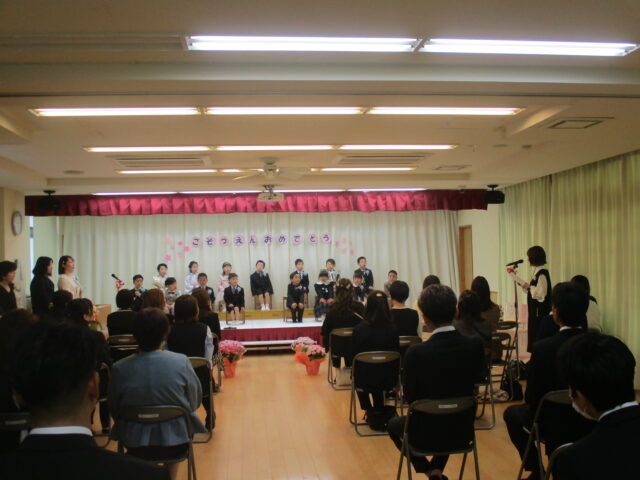 保護者の方の笑顔や涙に見守られながら、卒園証書授与やお別れの言葉、歌「ね」をうたいました。